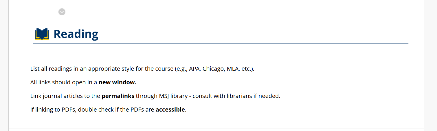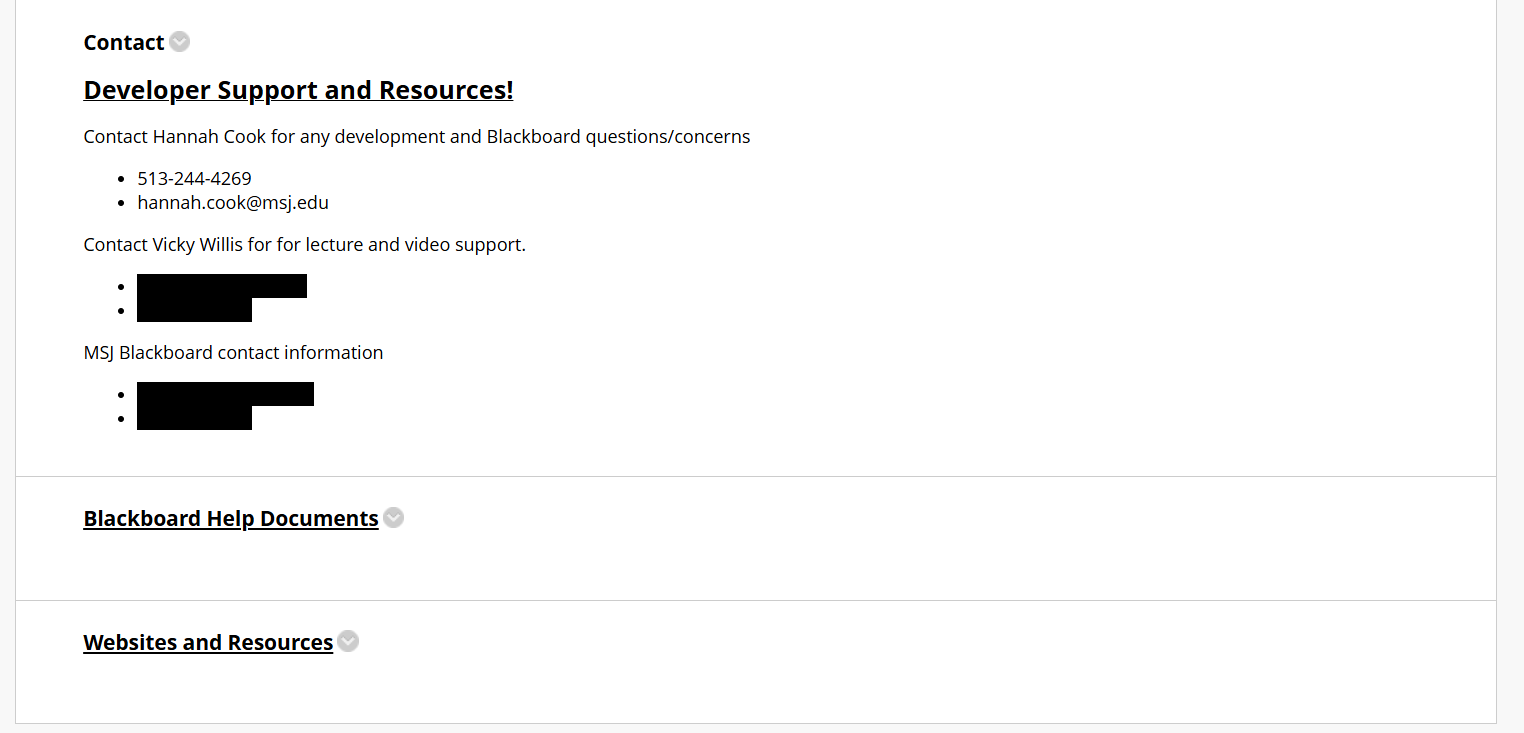 Description: I manage and support contracted developers for MSJ. The developers are hired to create new course content and build it out in Blackboard. This online template was created to ensure that all online courses were unified and consistent. This is both a helpful resource for developers and a tool to ensure a certain standard is met within each new course.